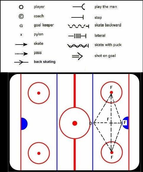 This pattern is used against the BOX defense so that passing lanes are opened up for us. Note that one of the defensemen becomes a forward. The "attack triangles" are indicated. The point of vulnerability here is the "quarterback" point man. He is NOT to fool around with the puck to the point of risking a breakaway. If he is in trouble, he is to pass it off, or dump it into be safe. As with any powerplay, the idea is to keep CONTROL of the puck and patiently wait for an open shot: keep the puck moving. |