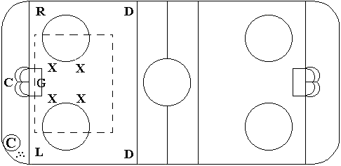 Defensive and offensive players line up as shown. This is a drill to help train the penalty kill unit. Players move ONLY within the zoned area in a box configuration.
