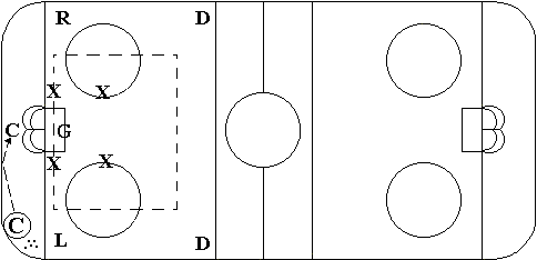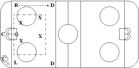 Coach passes to the center or player behind the net. Defending defenseman come up to the goalie line and no further (unless the puck carrier can not control the puck, then go in to tie up the puck for a face off. |