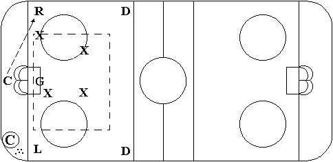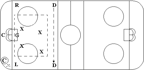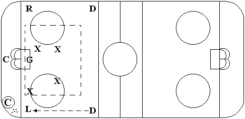 Center man passes the puck to the a winger. Again, defensive unit stays within the box formation. It is also OK for the defenseman in the defending zone to pressure the puck carrier. But, not past the indicated zone (unless the puck carrier can not control) Then the defender goes in to tie up the puck for a face off. |