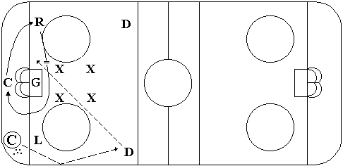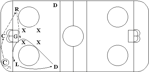 PART I above Players line up as shown. The purpose of this drill is to teach the power play line how to move the puck around in the attacking zone. Coach initiates by passing the puck out to the point. Then the wing on the far side moves in to deflect the puck. Once the far winger moves in, the centerman behind the net moves to take up place where the far winger left. This is done in case the far winger misses the deflection, the centerman will be on top of it to recover the puck quickly. However, if the shot is not deflected the far winger continues to skate around behind the net to set up and replace the center. Coach will also pass to the other defenseman and center as well. Each line execute drill three times. |