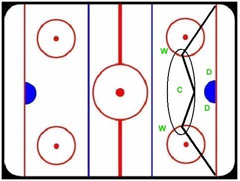 Zones indicate normal area of responsibility. Remember that players can replace each other: for example, if the center chases a player to a point area, the wing in that zone then "replaces" the center in the zone he was in. DEFENSE: -watch back door (area behind net around post) -guard net from post furthest from puck