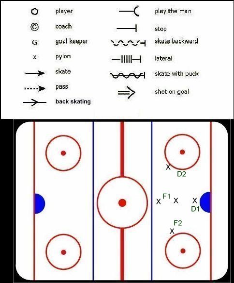 This is used to defend against a power-play with one point man. In the diagram, the X-men are the attackers. Our responsibilities are as follows: F1: Pressure 'quarterback' point man. If puck moves to a wing, drop to high slot, and guard against cross ice pass. F2: Read behaviour of wings. If puck moves to your side, pressure close wing, and take away shooting lane. D2: Read behaviour of wings. If puck moves to opposite side wing, drop to guard net area from post furtherst from puck, and watch the back door. D1: Guard net area and low slot, only tie the attacker up in front when a shot is imminent. KEY IDEAS Note that similar to the slant-box, no matter what, the high and low slots are protected first. F1 has the hardest job by having to cover both high slot and middle point, but if middle point gets puck, then F2 must be prepared to replace F1 in high slot. ALWAYS clear rebounds: ideally your goalie should only have to stop the first shot. If a shot is coming from the middle, F2 and D2 "box out" potential screens and tips. Otherwise be careful not to screen the goal, or offer your body as a tipping object. |