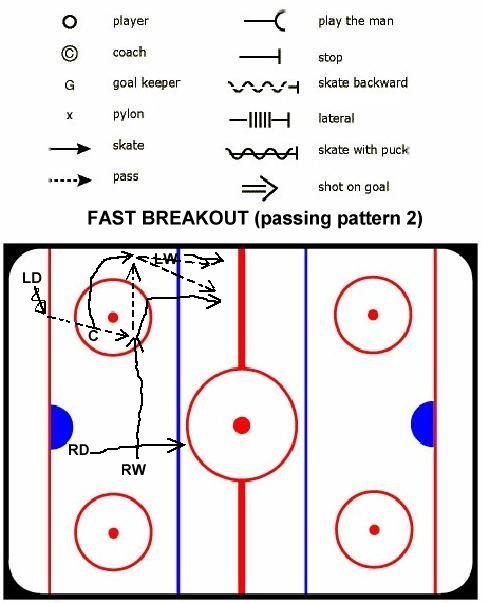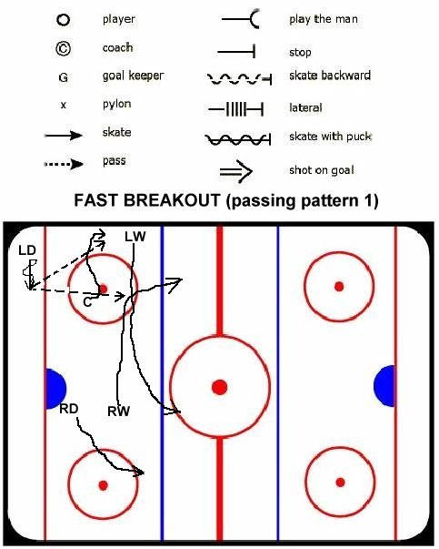 INSTRUCTIONS This will be our default breakout because it works better when we are pressured. Previously we were doing more of a Controlled breakout, which is more practical when we have more time: such as on the power-play. A defenseman in our corner with the puck initiates the play. If he does not have time, he can pass BEHIND net to his partner, and start from the other side: forwards be alert! There are TWO distinct passing patterns: PASSING PATTERN 1: Defenseman exercises option of passing ahead to either C or RW who are both curling to his side. Then C and RW come out together to overload strong side. PASSING PATTERN 2: If the LD passes to the RW, he then has the option of passing to the C along the boards who passes up to LW, or he can carry out himself, or he can pass to the LW. In any case, the RW and LW overload the defenseman on that side! NOTES: The puck is NOT carried behind the net. Create a 2 on 1 on opposing defenseman.