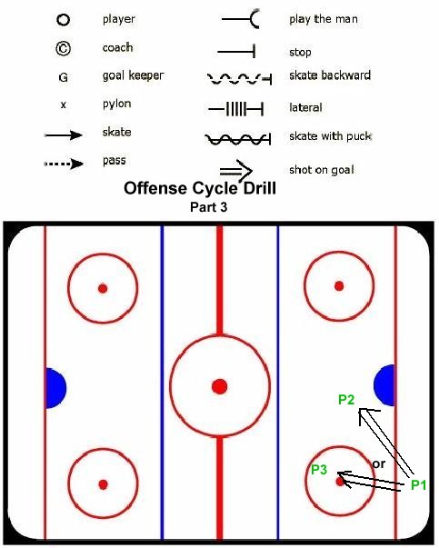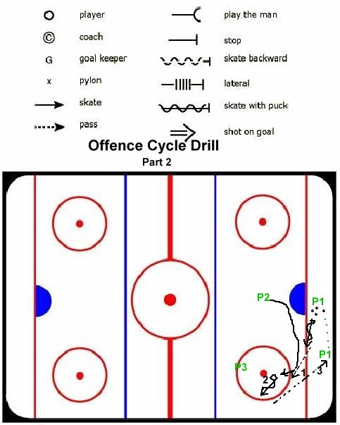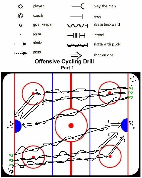 Drill is symmetrical at each end. STEP 1: All three players carry a puck, and shoot - stagger shots by a second or 2. STEP 2: P1 picks up a free puck behind the net and begins "cycling" system. STEP 3: Cycle a couple of times by playing a three man weave, and then player nearest boartds with puck can pass out for a shot to either the player in the slot or the player at the circle. Players shoudl strive to cycle and replace in such a way as to maintain and imaginary triangle with TWO shooters in position to shoot at any time. If the shooter at the top of the circle gets it, he can pass to the shooter in front, or shoot LOW to try to get a rebound. |