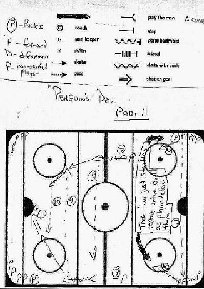 line up at all 4 corners. Goalies in both nets. Two players skate down together on opposite sides of the ice, passing back and forth at least one pass before they hit the next line each time. When they get into the opposite zone from where they started, the player with the puck passes to the first player in the line on his side of the ice. The player in line receiving the puck passes across to the player first in line on the other side, and then that player passes it back up to the skating pair who have by now turned around and crossed sides of the ice. The skaters take the puck back down, passsing as before, but this time they shoot on goal and then return to the end of the line when done (ONE SHOT and get back on line). Meanwhile the two players who were first on line at the other end have started their way down passing and skating, and they will execute the same pass, cross over, and turn-around maneuver. This continues until everyone has gone twice. It is essential that everyone pay attention and pass accurately to keep the flow going... |