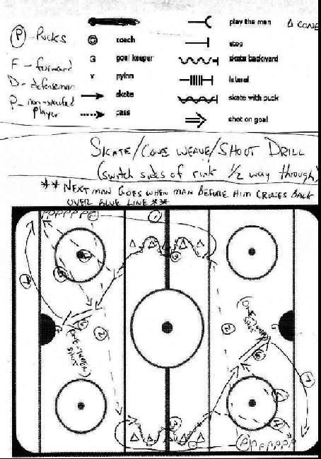 There will be two rows of cones in the neutral zone approximately 2 ft apart in line with the face off dots - arranged lengthwise with the rink. The first player on each line will skatequickly to the top of the opposite face-off circle and start turning around while receiving a pass from whoever is now first in line at the opposite end. Then the player will cut hard back around the nearest cone on the same side of the rink he started on, and procede to weave in and out of the cones with the puck: it is important to keep the legs moving, heads up, and skates crossing over. Power and balance are all key to making your way through traffic. Cup and curl the puck near your body as you go. After navigating the cones, they player will pass the puck into the LAST player in line at that end, and then will quickly receive a ONE-TIMER for a shot on goal. NO-DEEKING - take your best one-timer (put pressure on your stick to contain the puck, and snap it). Take aim BEFORE you get the puck. Again - everyone must PAY ATTENTION for this to work. Both first and last in line have to make passes. Be sure to quickly collect errand pucks and send them to the front of the line! |